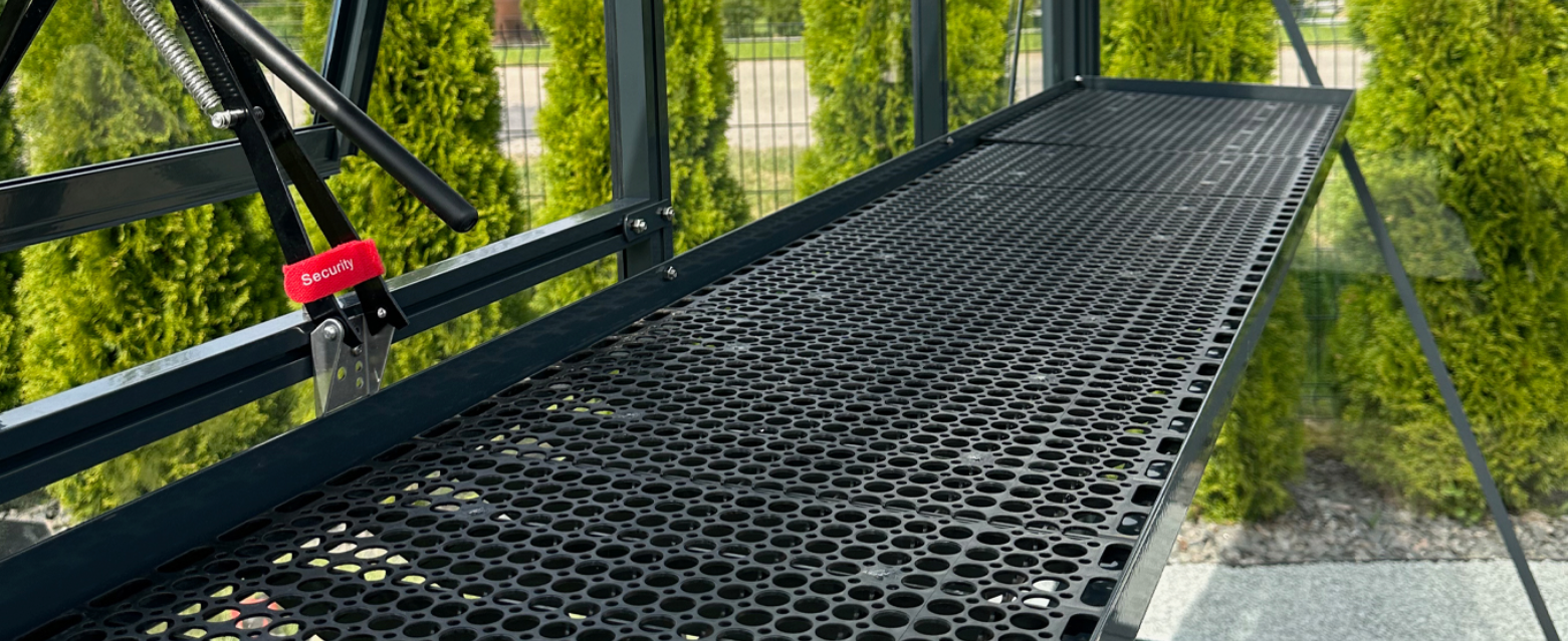 The top surface is covered with black plastic, honeycomb-like trays (30 × 40 × 5 cm). These inserts allow water and soil to drain downward, maintaining a clean and dry floor while promoting air and light circulation.