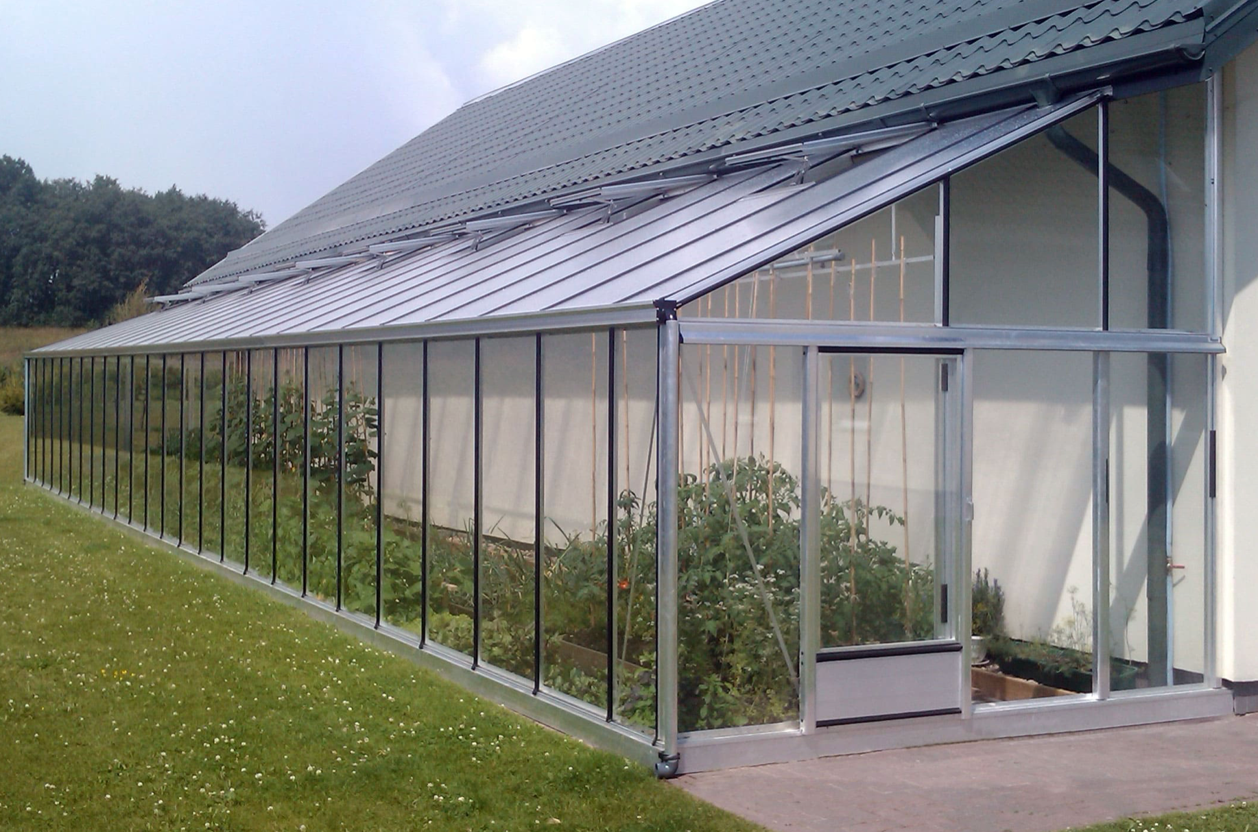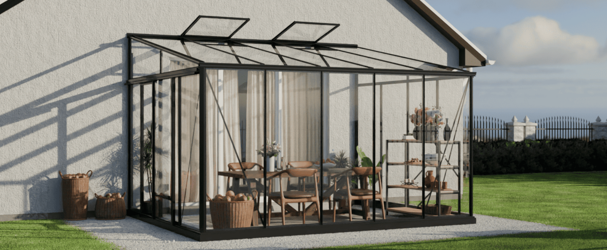 The MURUS greenhouse boasts a single-pitched, three-sided structure that seamlessly attaches to an existing building, such as your house, garden shed, garage, or terrace. This design creates a space-efficient and stylish extension.