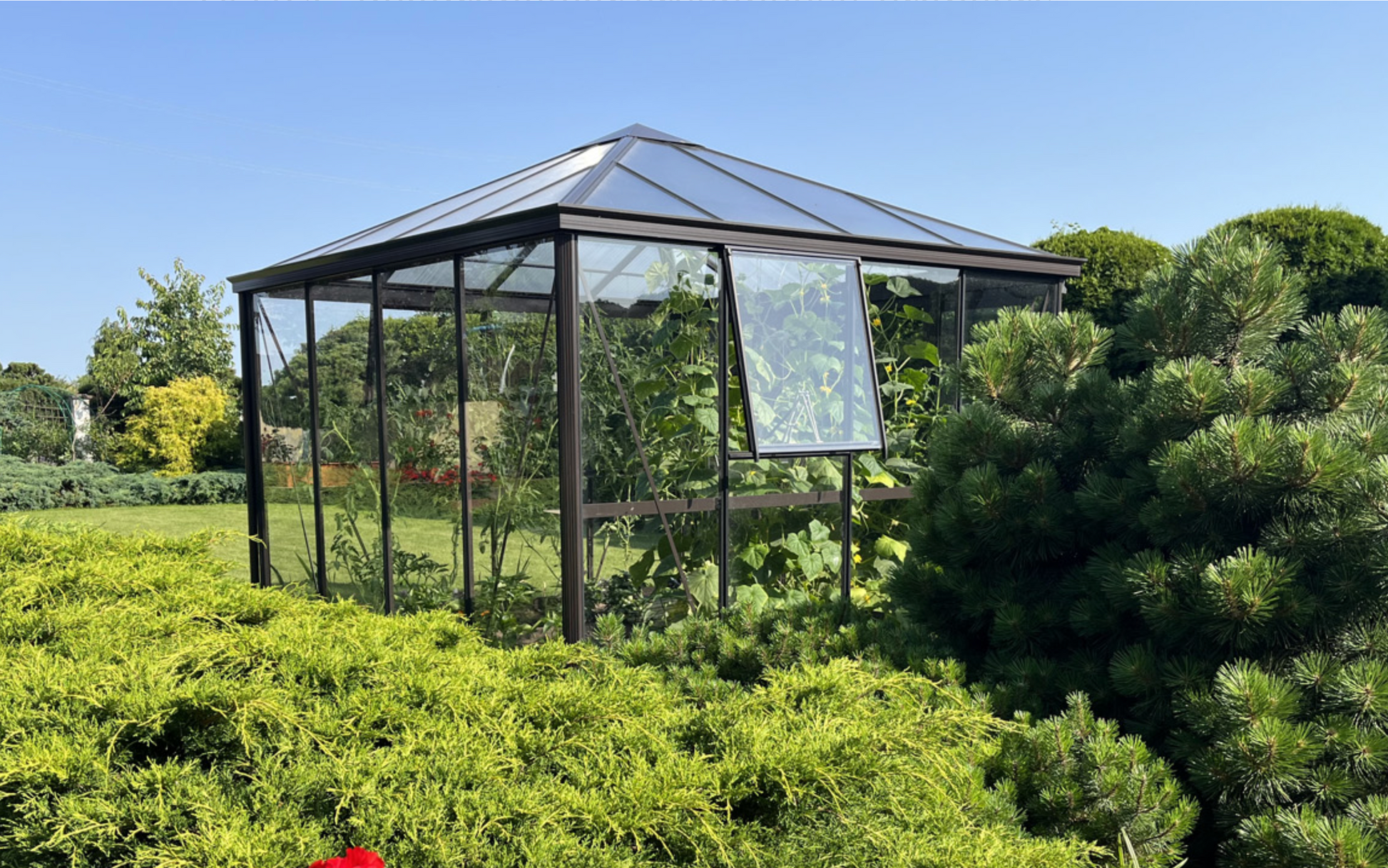 The PYRAMID aluminum greenhouse orangery is a highly practical and functional structure. It features a four-sided pyramid-style roof, elevated sidewalls, and a double sliding door. The elegant lines and sharp right angles create an exceptionally efficient and spacious interior layout, closely resembling the shape of a room in a house. This familiar form enhances comfort and functionality, making it an inviting extension of your living space.