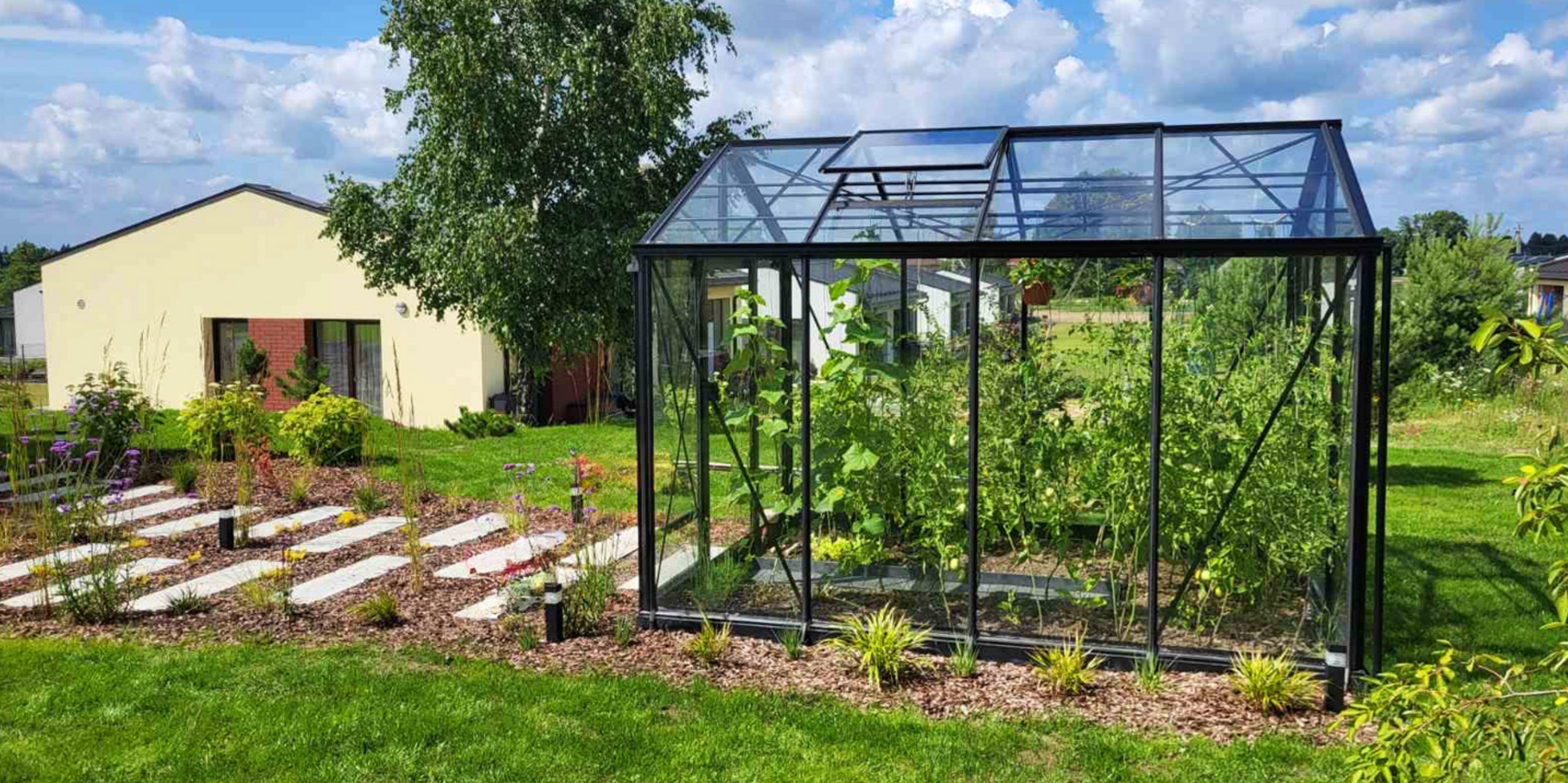 The VENTUS aluminum greenhouse, our most popular model, features a timeless rectangular design characterized by its straight walls and gable roof. This elegant structure harmoniously combines functionality with expansive roof windows and a smooth-sliding door, ensuring effortless access and optimal ventilation.